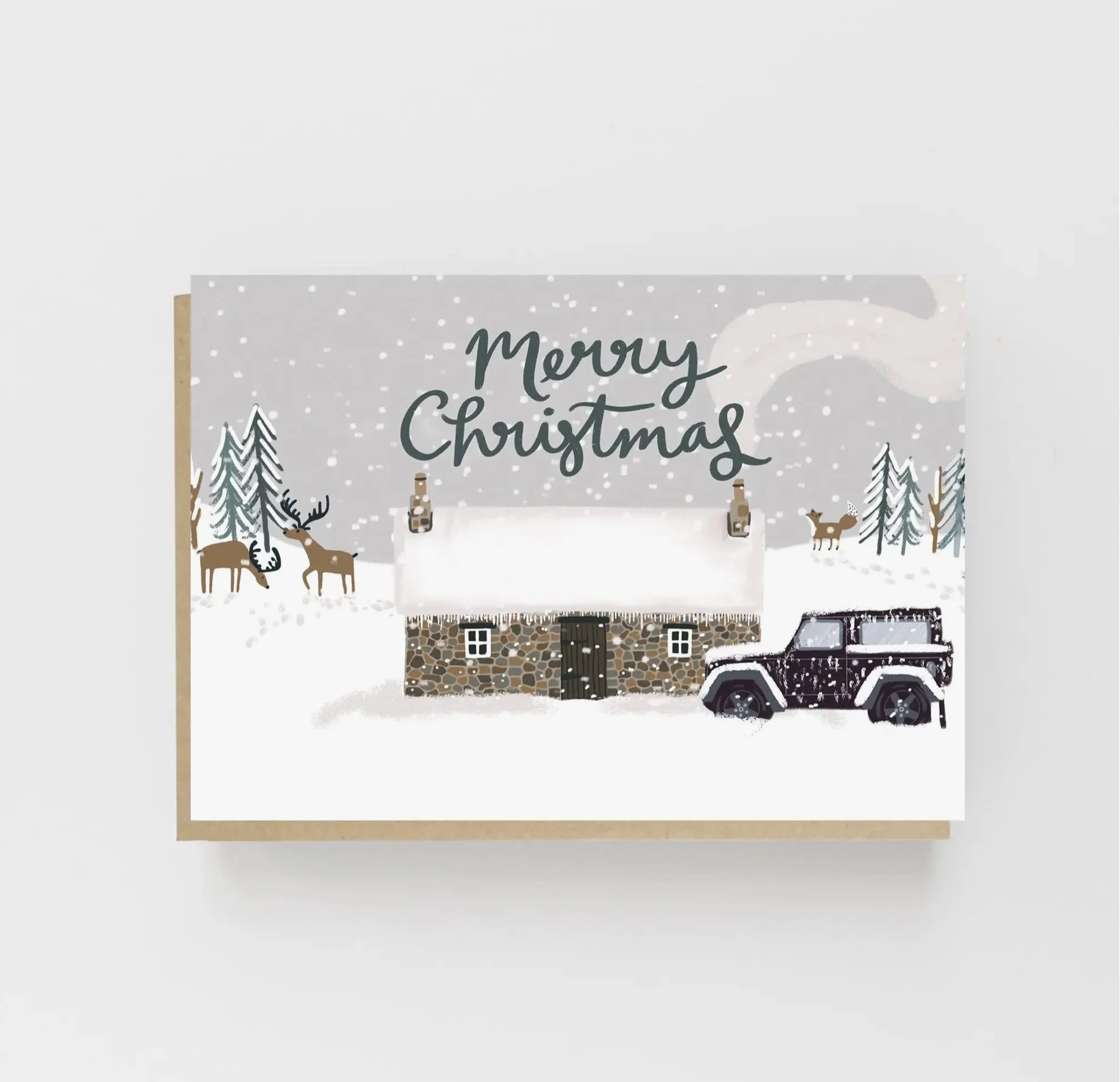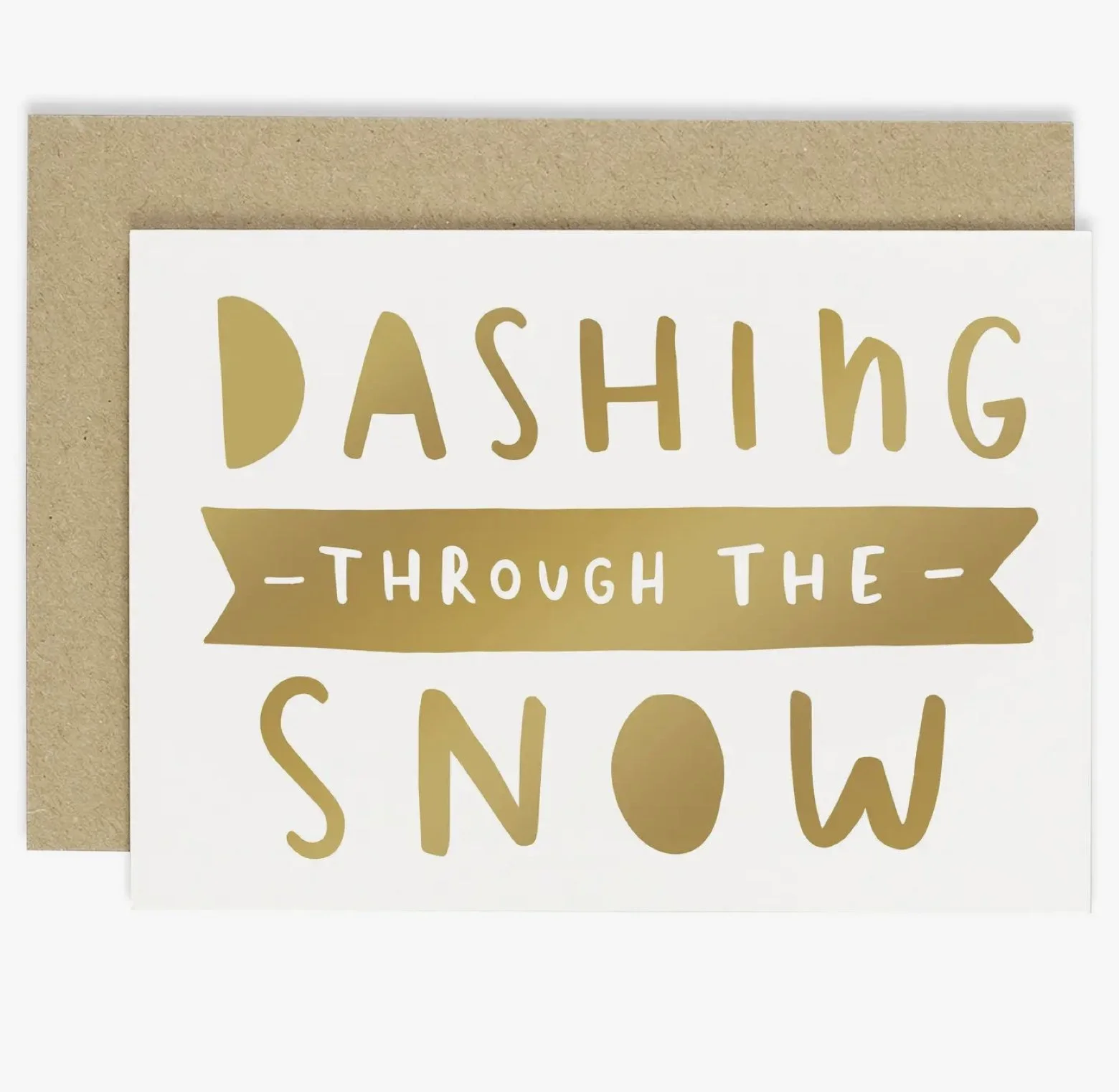 A simple and stylish hand lettered Christmas card that reads 'dashing through the snow'.